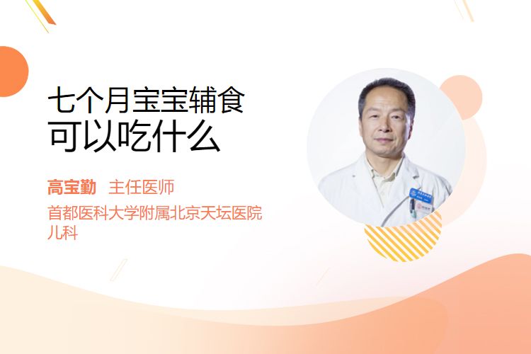 七个月宝宝辅食可以吃泥糊状主食、蔬菜泥、水果泥、肉泥、蛋黄。