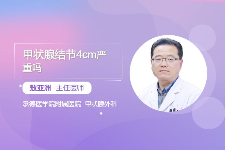 甲状腺结节4cm的严重程度需综合多方面因素判断,若为良性结节,未压迫周围组织时可观察,有压迫症状等时可手术,儿童、老年良性结节情况各有不同;若为恶性结节则较严重,需尽快手术等治疗,儿童、老年恶性结节治疗也需兼顾相应情况,发现4cm甲状腺结节应及时就医明确性质并制定诊疗方案。