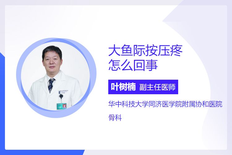 大鱼际按压疼可能由肌肉劳损或外伤、腱鞘炎、颈椎病、其他疾病等引起,不同人群需注意相应事项,出现持续不缓解或伴严重症状时应及时就医做详细检查以明确病因并治疗