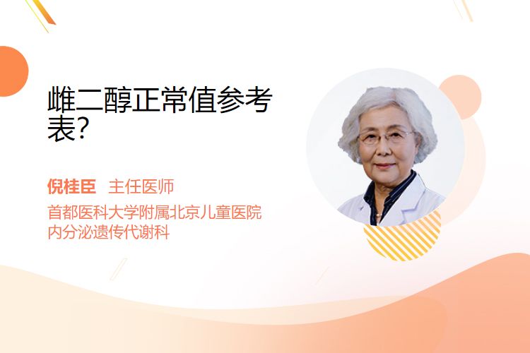 雌二醇正常值参考表:成年女性卵泡期~50pg/ml,黄体期~200pg/ml,绝经后<20pg/ml;男性参考值通常<40pg/ml;青春期女性随年龄增长逐步上升,13-14岁约20~80pg/ml。